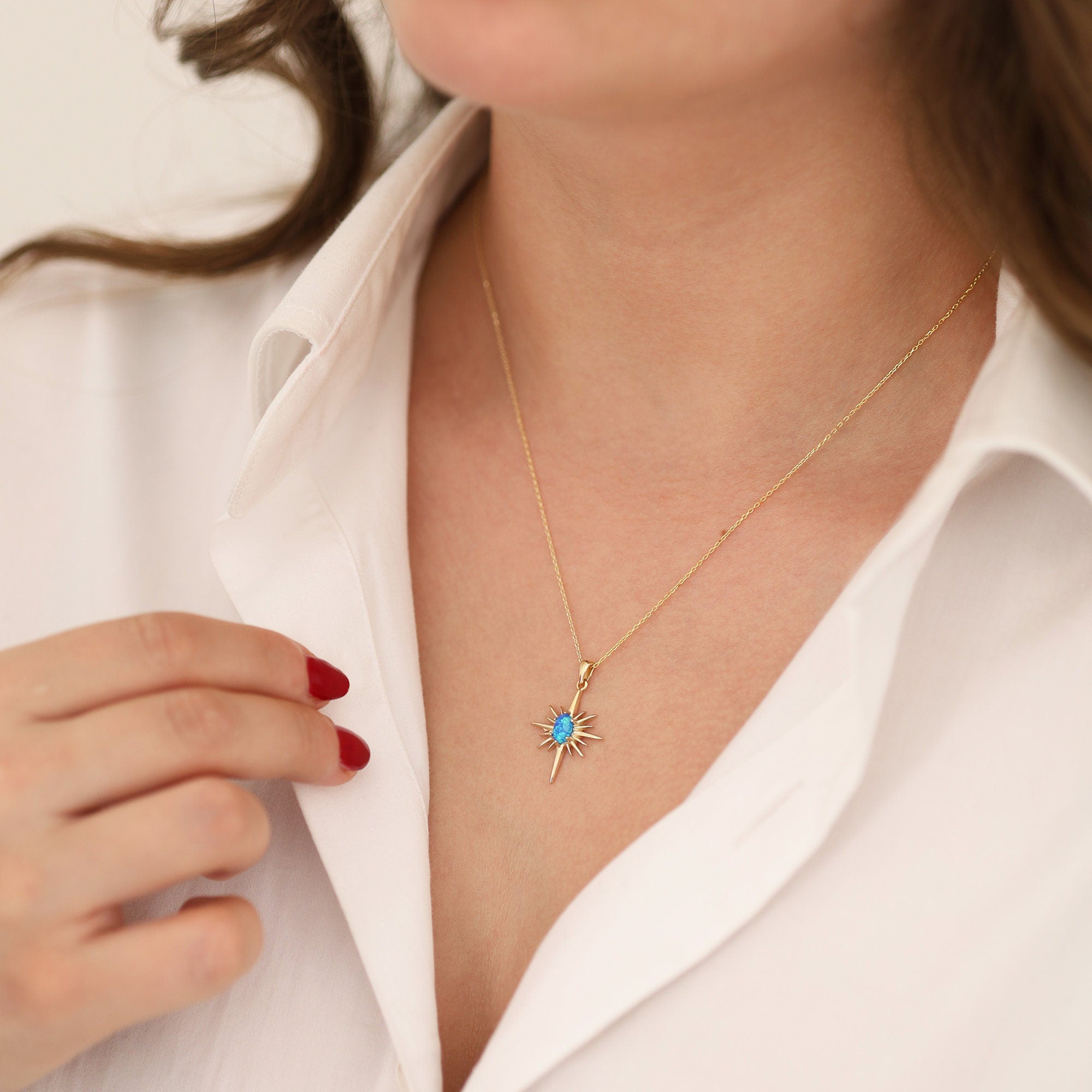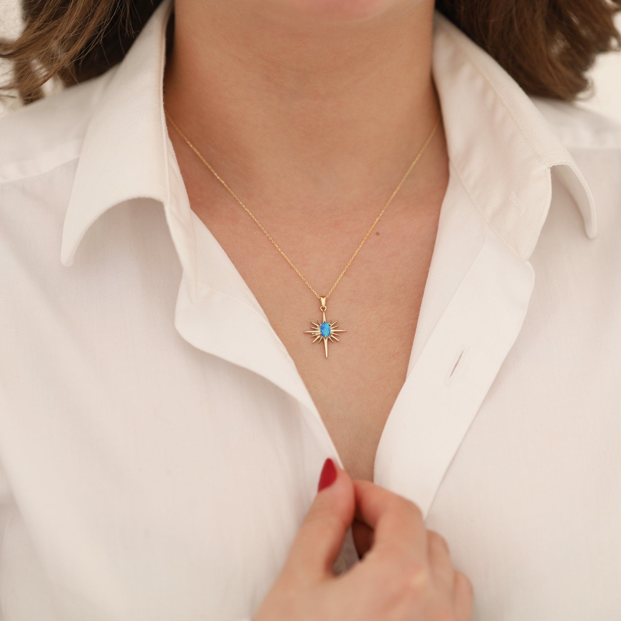 The 14k Gold Blue Opal North Star Necklace combines the captivating beauty of blue opal with the symbolic guidance of the North Star. This elegant piece exudes sophistication, perfect for any occasion. Known for promoting creativity, confidence, and direction, this necklace is a timeless accessory and a meaningful gift for loved ones.