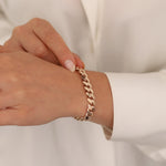 Enhance your look with our 14k Gold Heavy Cuban Chain Bracelet, handcrafted from genuine 14k gold. With a robust design weighing 12.2g for a 7' length and a unique meshed inner side, this bold bracelet reflects the spirit of Istanbul’s historic Grand Bazaar and quality craftsmanship—perfect for daily wear or making a statement.
