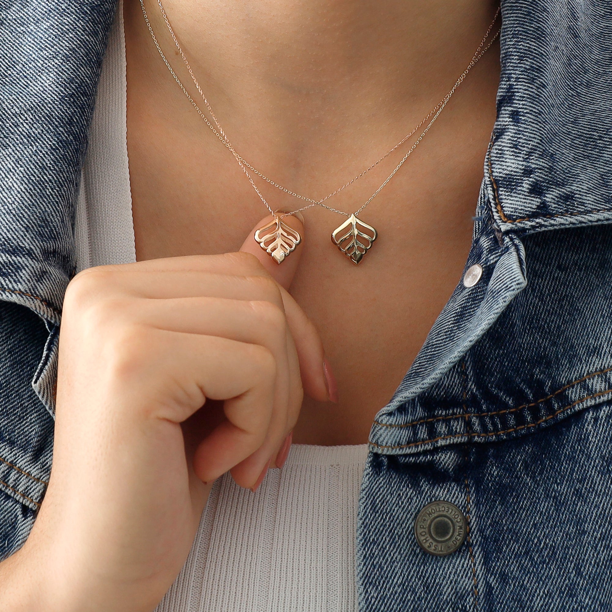 Our 14k Gold Puffy Leaf Necklace captures the essence of falling autumn leaves in a timeless piece. This 3D leaf design comes in four sizes and three gold tones—yellow, rose, or white. Wear it alone for a simple statement or pair it with matching earrings for a coordinated look. A romantic nod to nature, it’s an elegant choice for daily wear or special occasions.