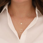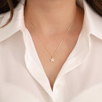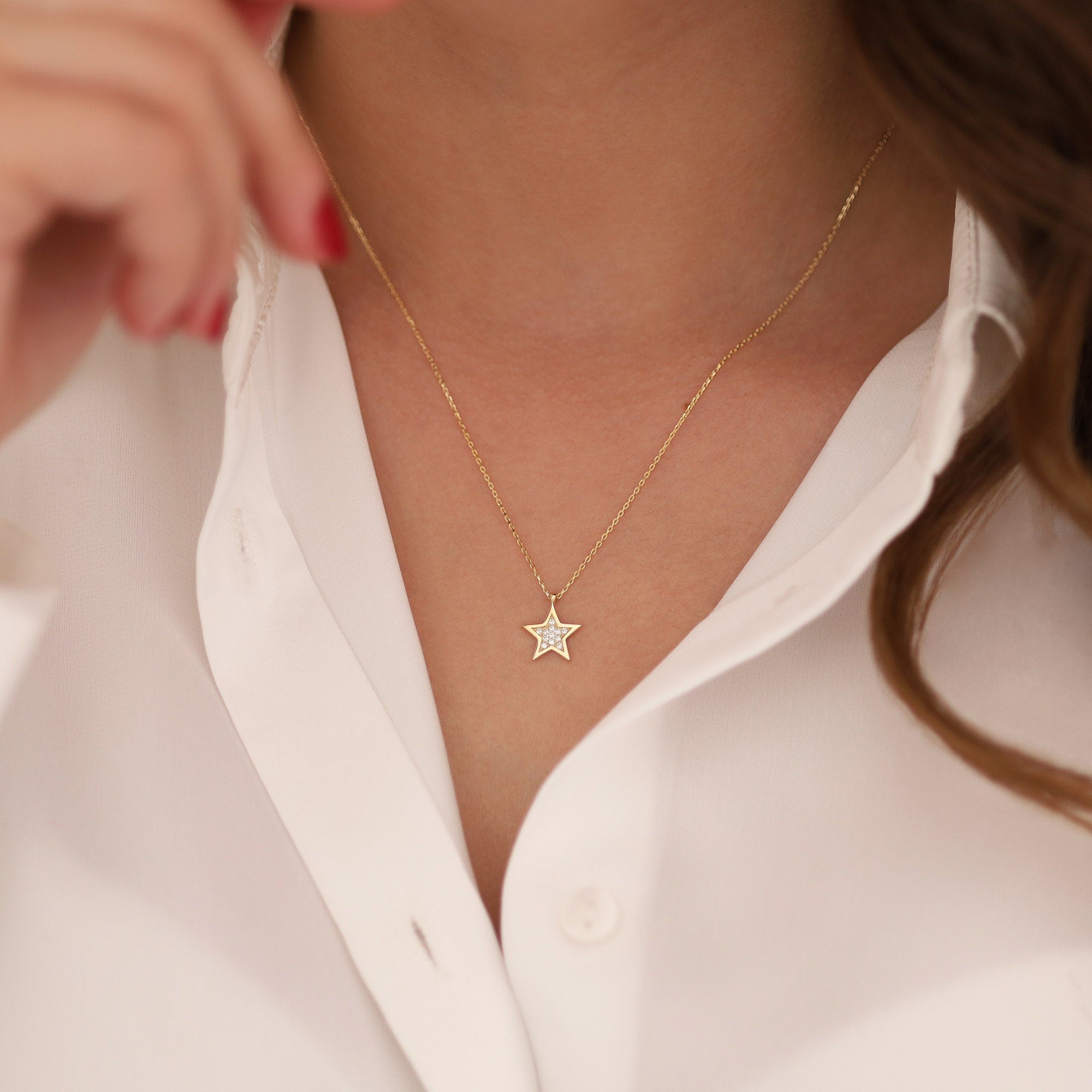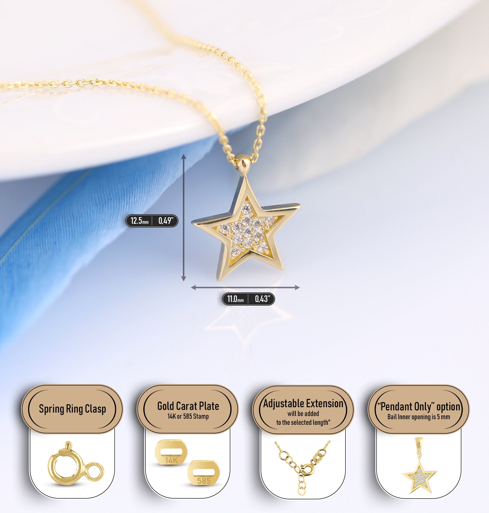 Elevate your look with our captivating 14k Gold Star Zircon Charm Necklace. This exquisite piece features a delicately crafted star-shaped charm made of genuine 14k gold and embellished with brilliant cubic zirconia for a subtle, enchanting sparkle. Its minimalist design offers versatile wear—perfect on its own or layered with other necklaces for a personalized look suitable for any occasion. A timeless accessory that adds celestial charm to your ensemble, it makes an ideal gift for anniversaries, graduations, or a special treat for yourself.