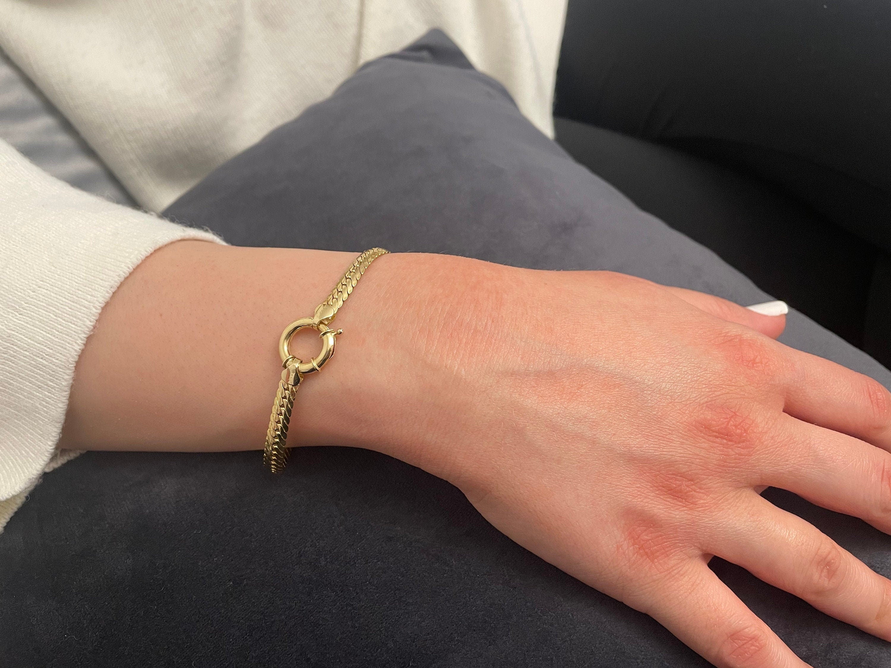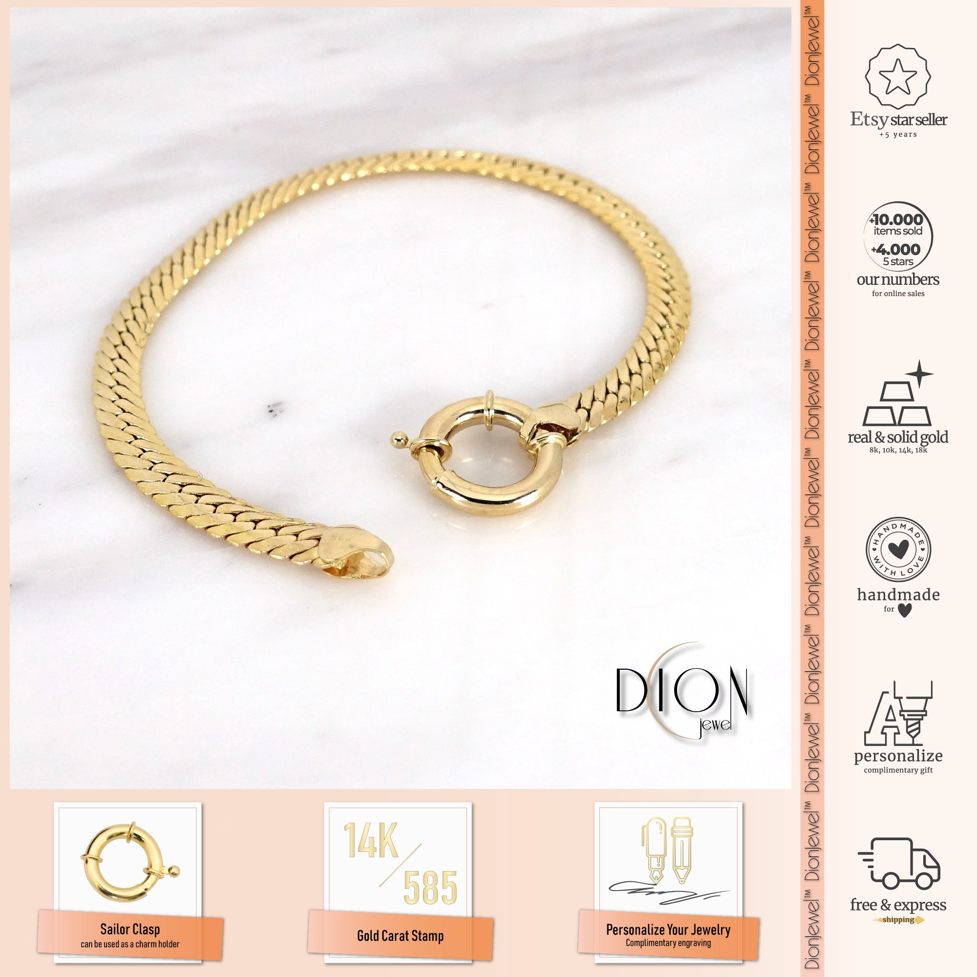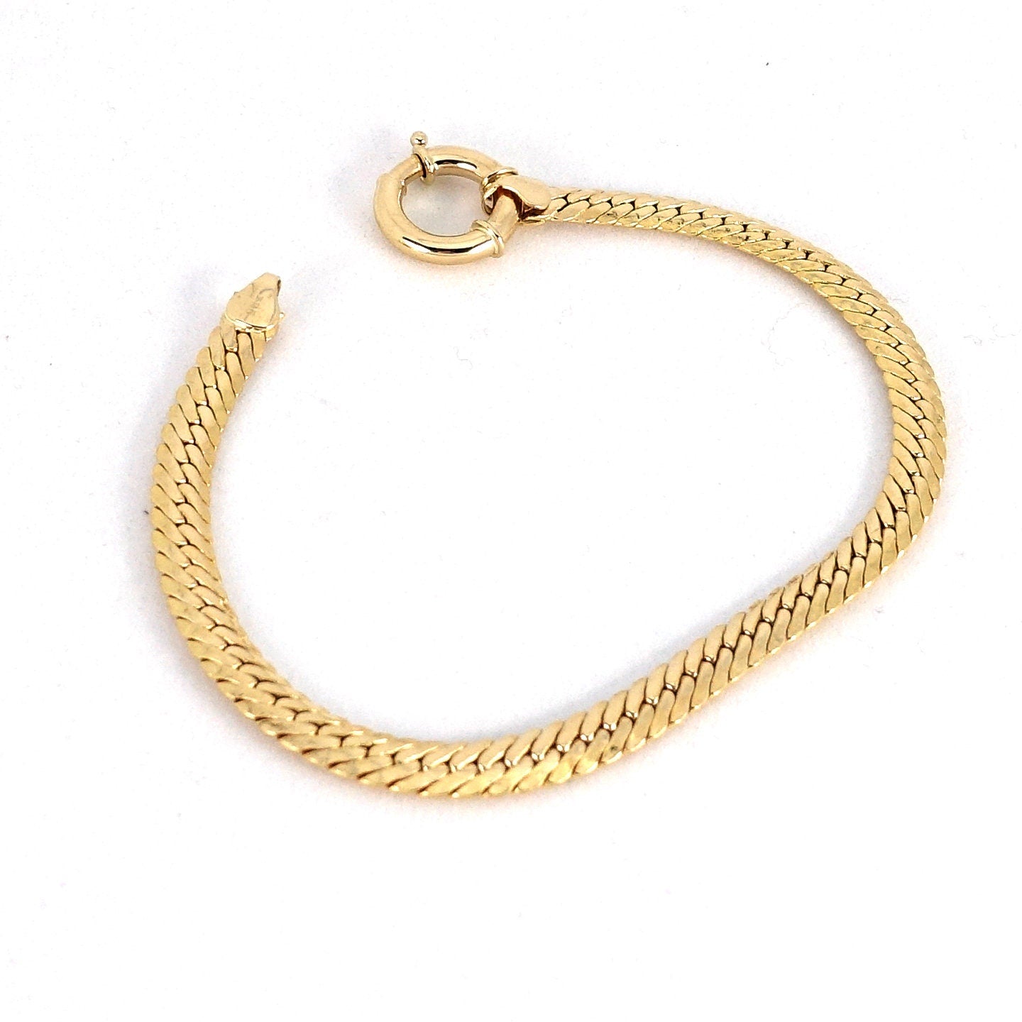 Elevate your style with our 14k Gold 5mm Herringbone Bracelet featuring a classic sailor clasp. This elegant bracelet boasts a flat herringbone chain design, perfect for both casual and formal occasions. The sturdy sailor clasp provides a secure and adjustable fit, ensuring comfort throughout the day. Whether worn alone for a subtle statement or stacked with other bracelets for a trendy look, this herringbone bracelet adds a sophisticated touch to any outfit.
