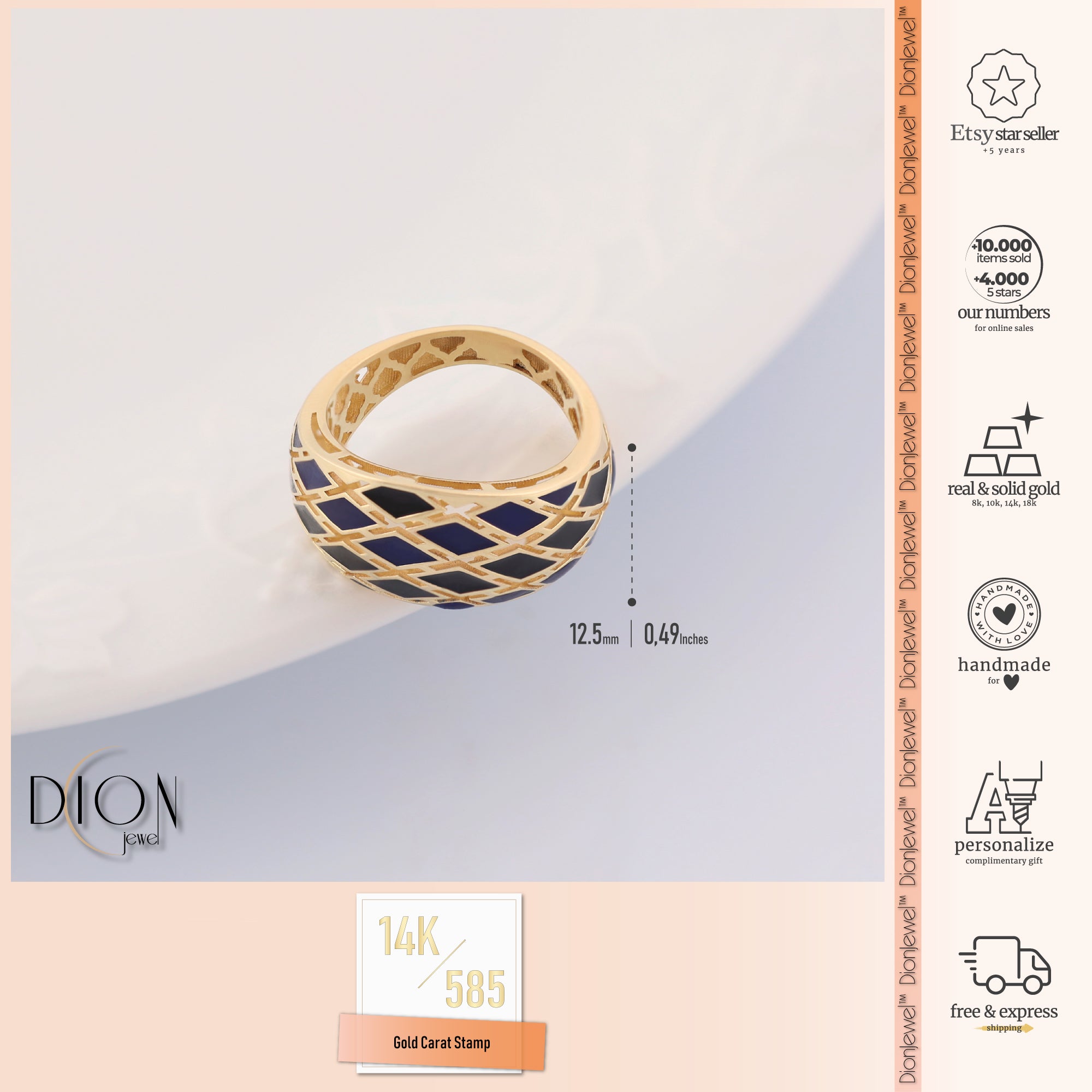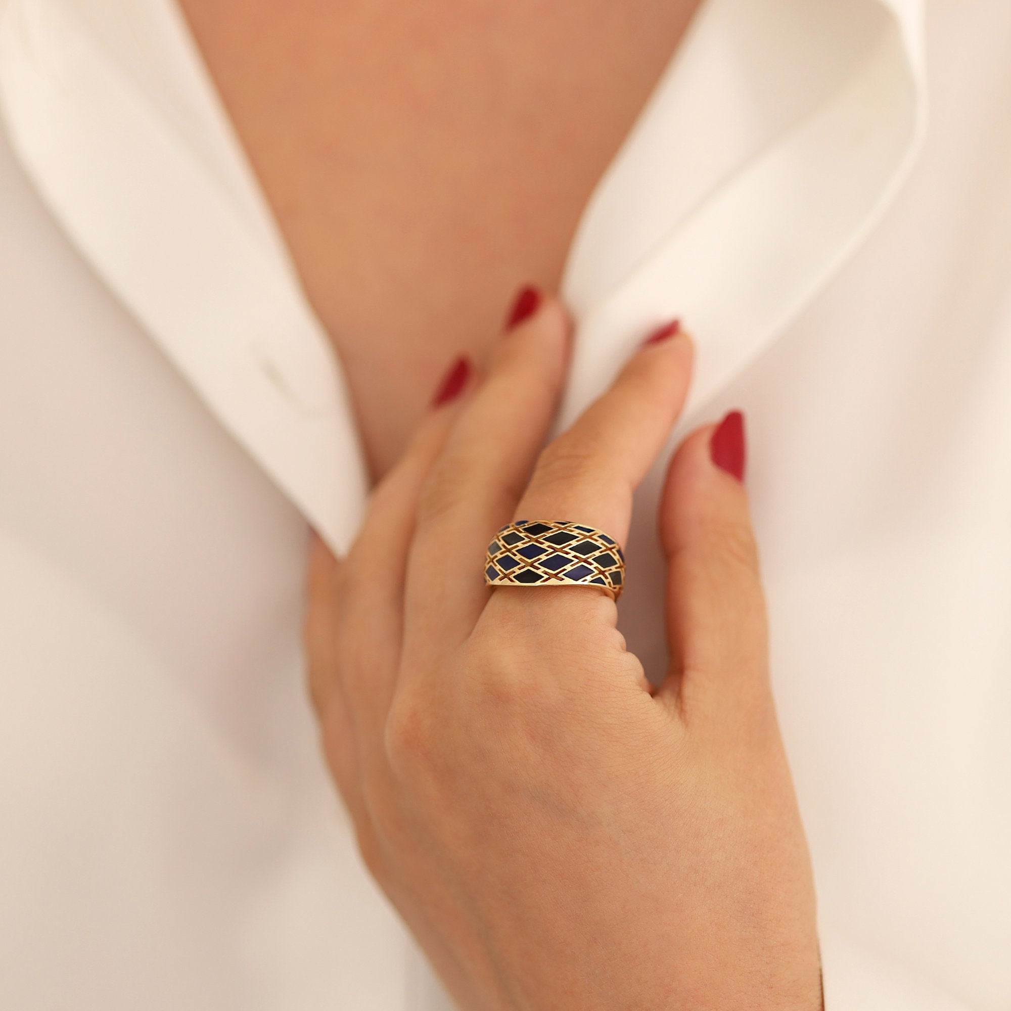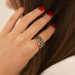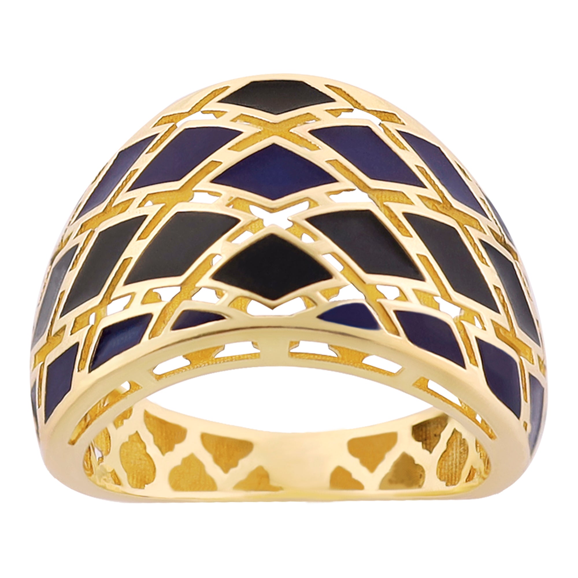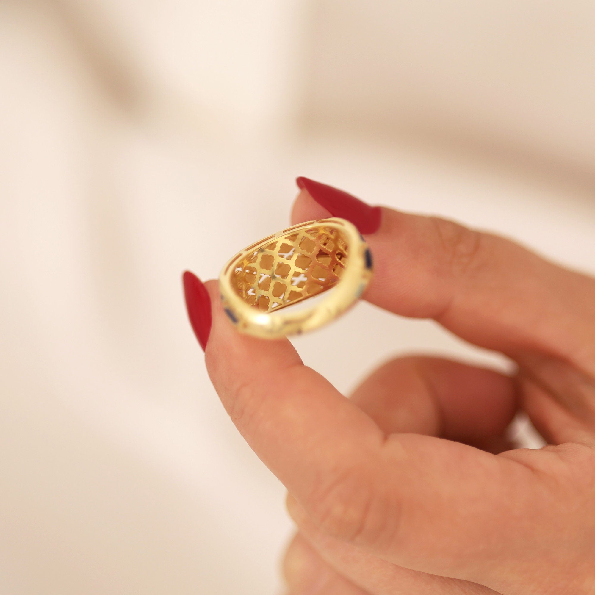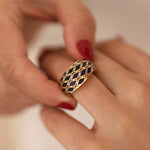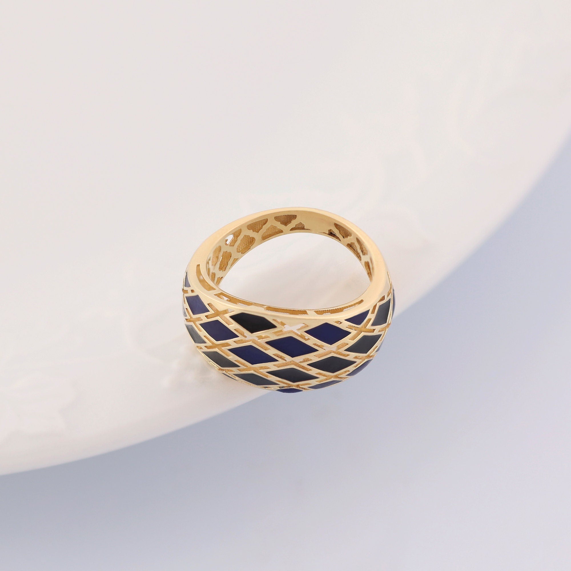 Be enchanted by our 14k Gold Navy Blue Intricate Ring. This magnificent ring features a robust, wide band that exudes strength and confidence. The exquisite perforated embellishments add refinement and craftsmanship, making it a beautiful statement piece. Handcrafted with meticulous attention to detail, the navy blue color adds mystery and elegance. Versatile in design, it can be worn on the forefinger or any finger, enhancing your jewelry collection with originality.