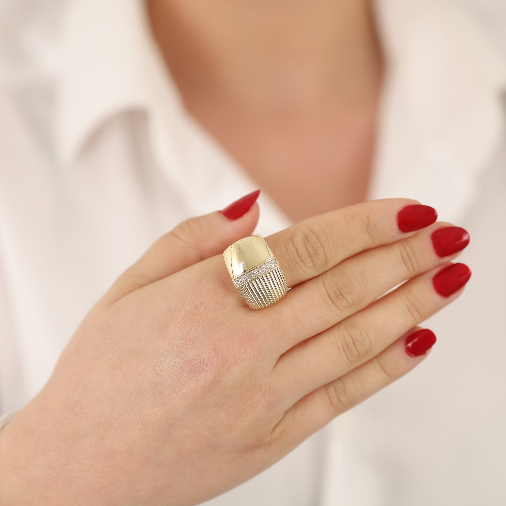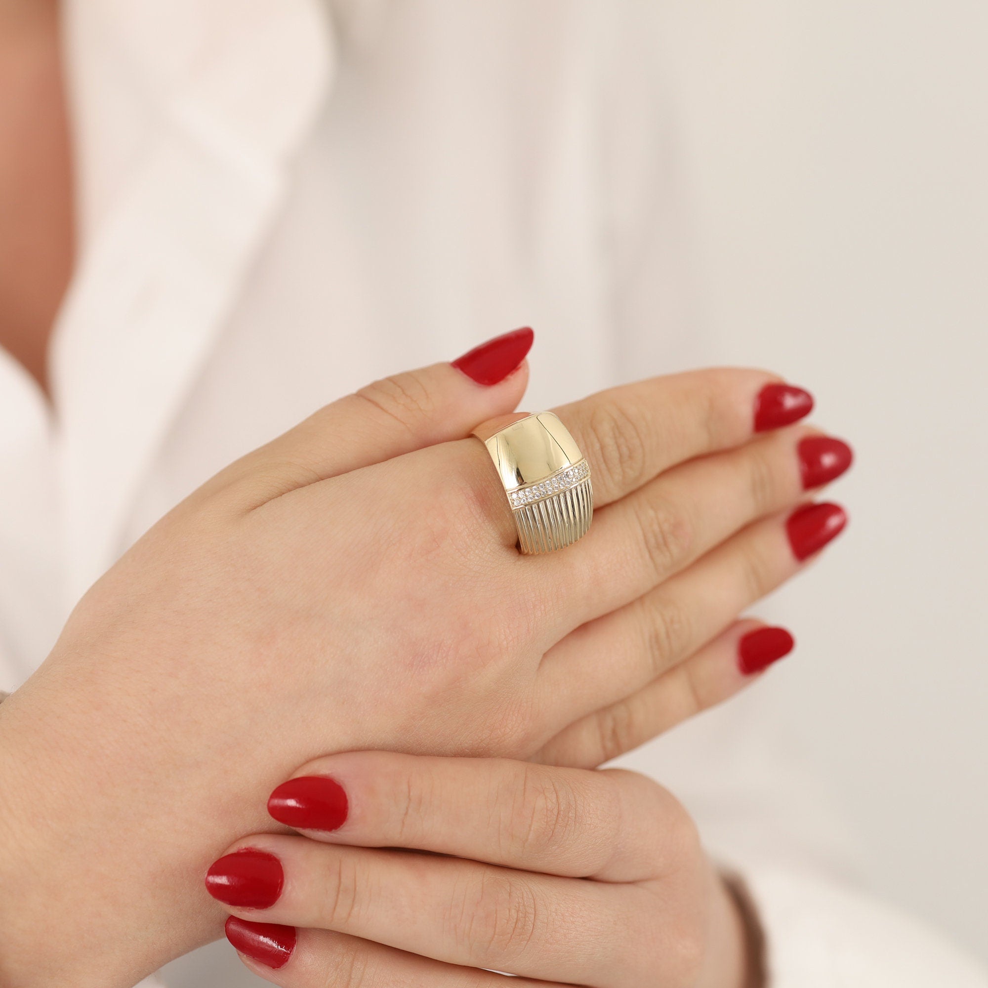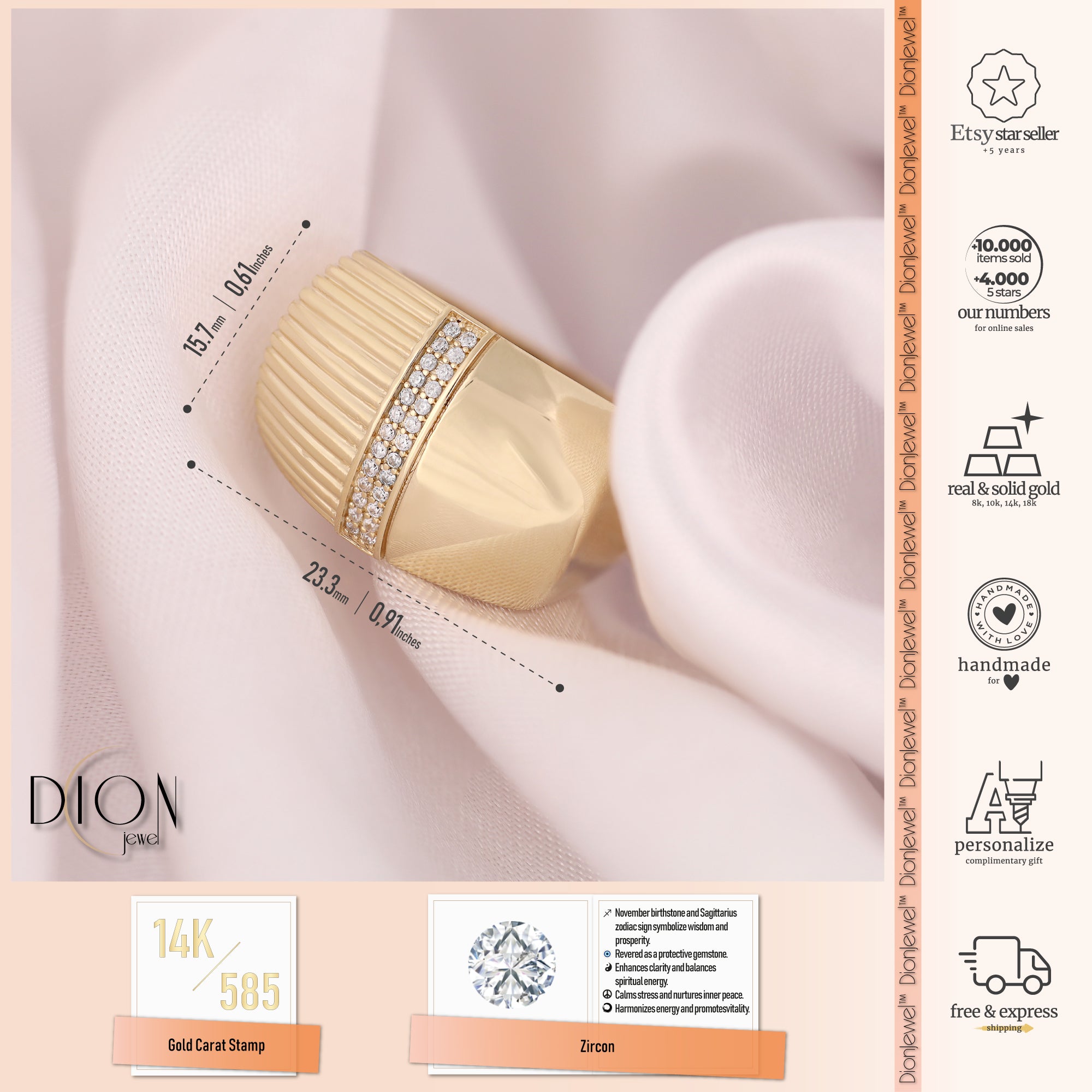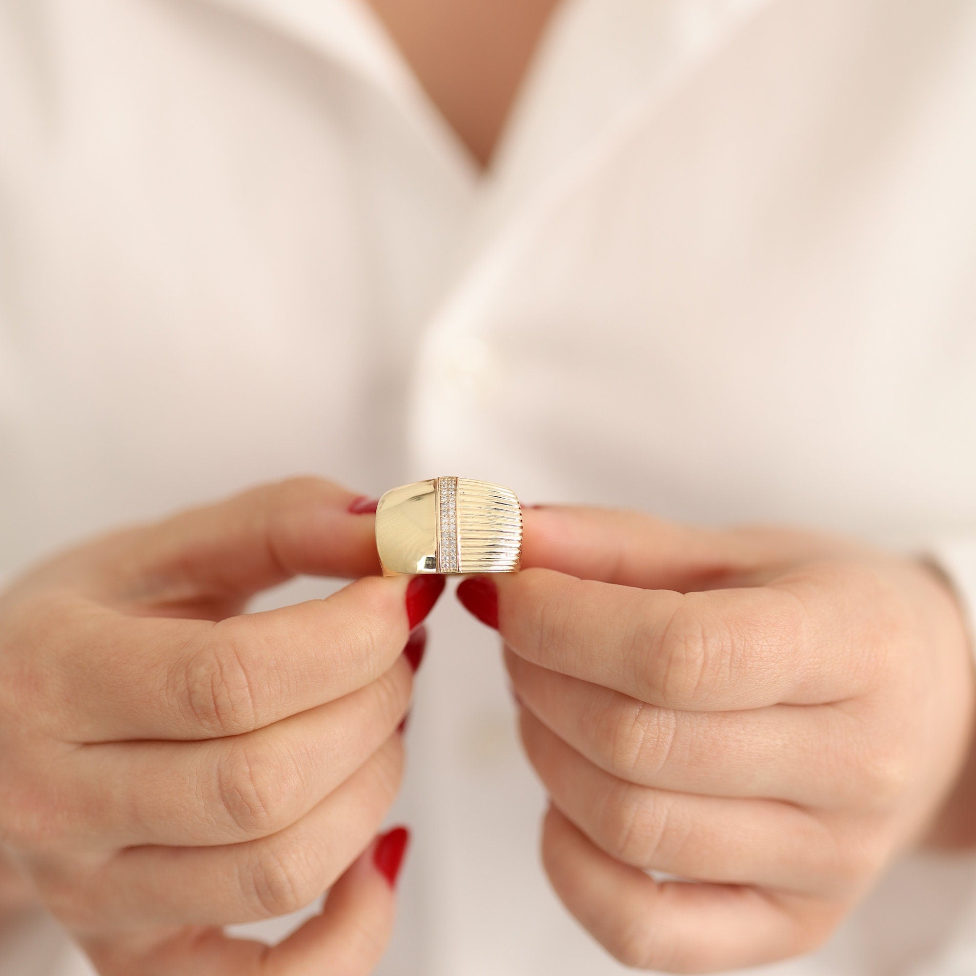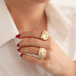 Make a bold statement with our 14k Gold Thick Fore Finger Ring. Featuring a wide band and captivating design, this ring complements any look, from casual to formal. Handcrafted from high-quality 14k gold, it offers both durability and timeless elegance. Wear it as a standalone piece for a striking appearance or layer it with other rings for a more dramatic effect. The fore finger style is a fashionable trend, perfect for expressing your unique style.