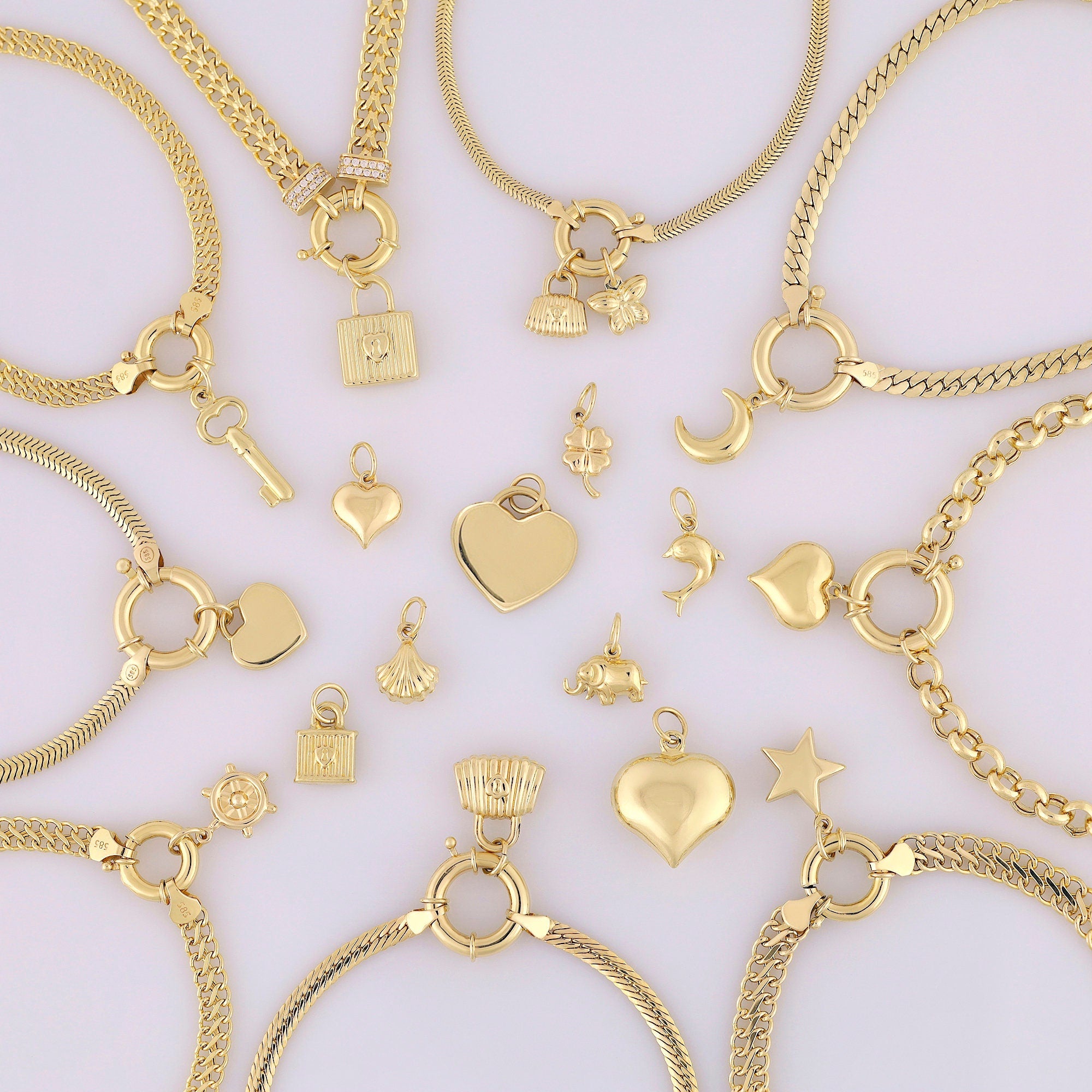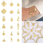 Elevate your jewelry collection with our 14k Gold Charms. Offering 18 unique charm options, each crafted from genuine 14k gold, these charms allow you to create personalized accessories that reflect your unique story. Choose from a variety of designs, including puffy hearts, padlocks, keys, stars, moons, sea shells, four-leaf clovers, dolphins, elephants, and butterflies. Whether you're celebrating a special event, commemorating a birthday, or expressing your personality.