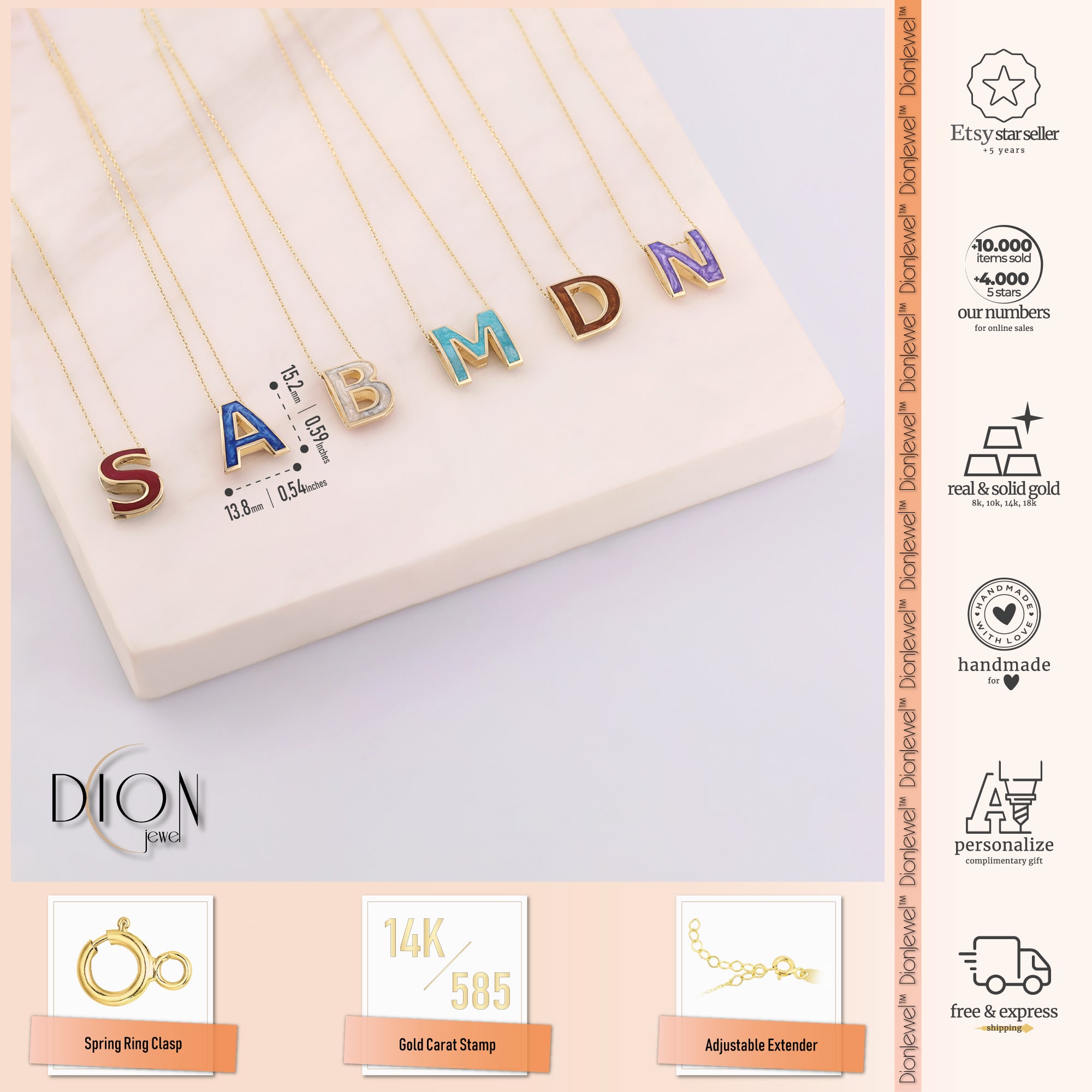 Elevate your style with the 14k Gold Letter Necklace featuring handmade enamel. Personalize it by choosing from 26 letters and two colors for the front and back. This creates a lovely shimmer when light hits it. It is a special statement piece or a heartfelt gift. Show off your individuality and enjoy the refined look and feel. Crafted with care, it blends playful color with graceful design. This versatile necklace adapts to any outfit, bringing a spark of fun and sophistication.