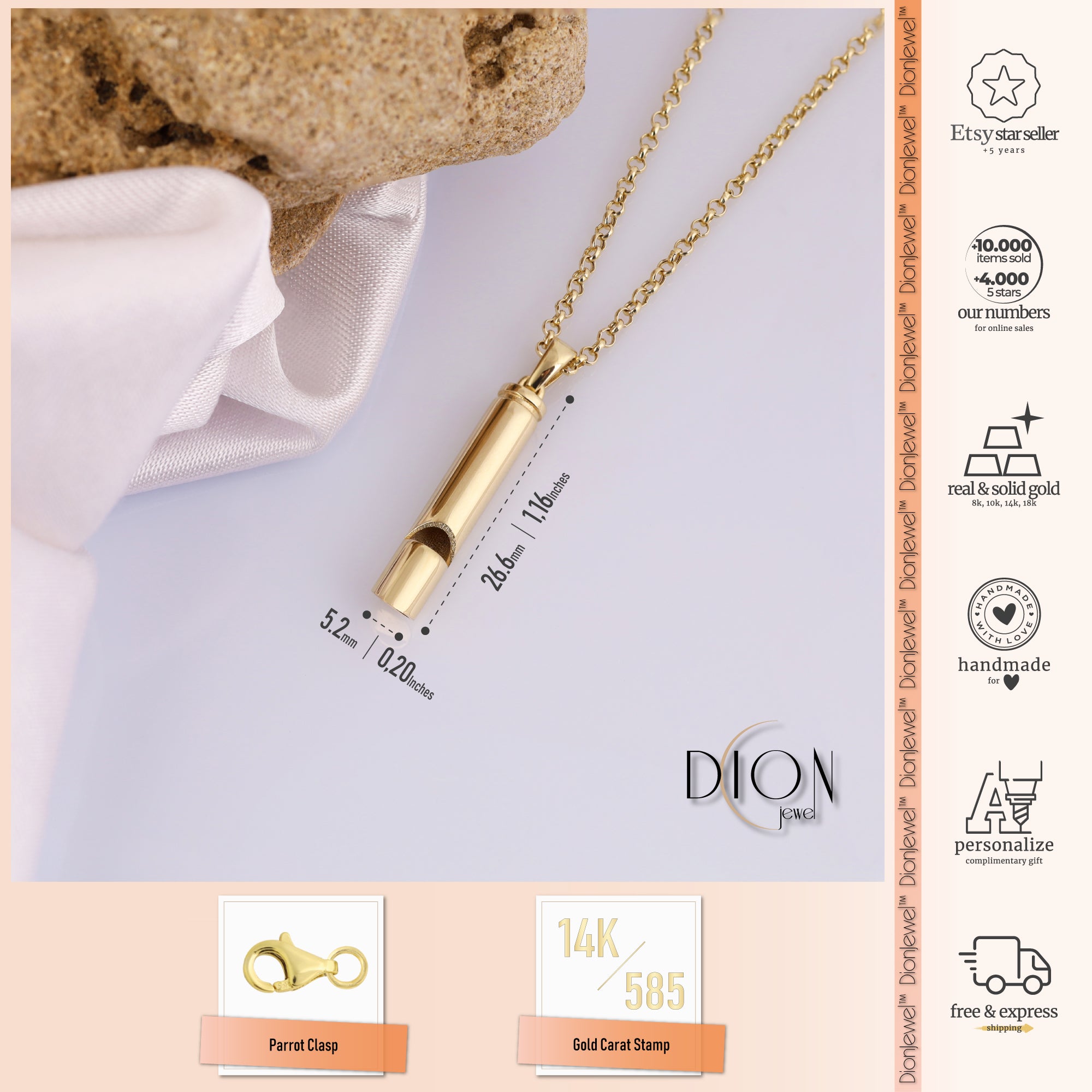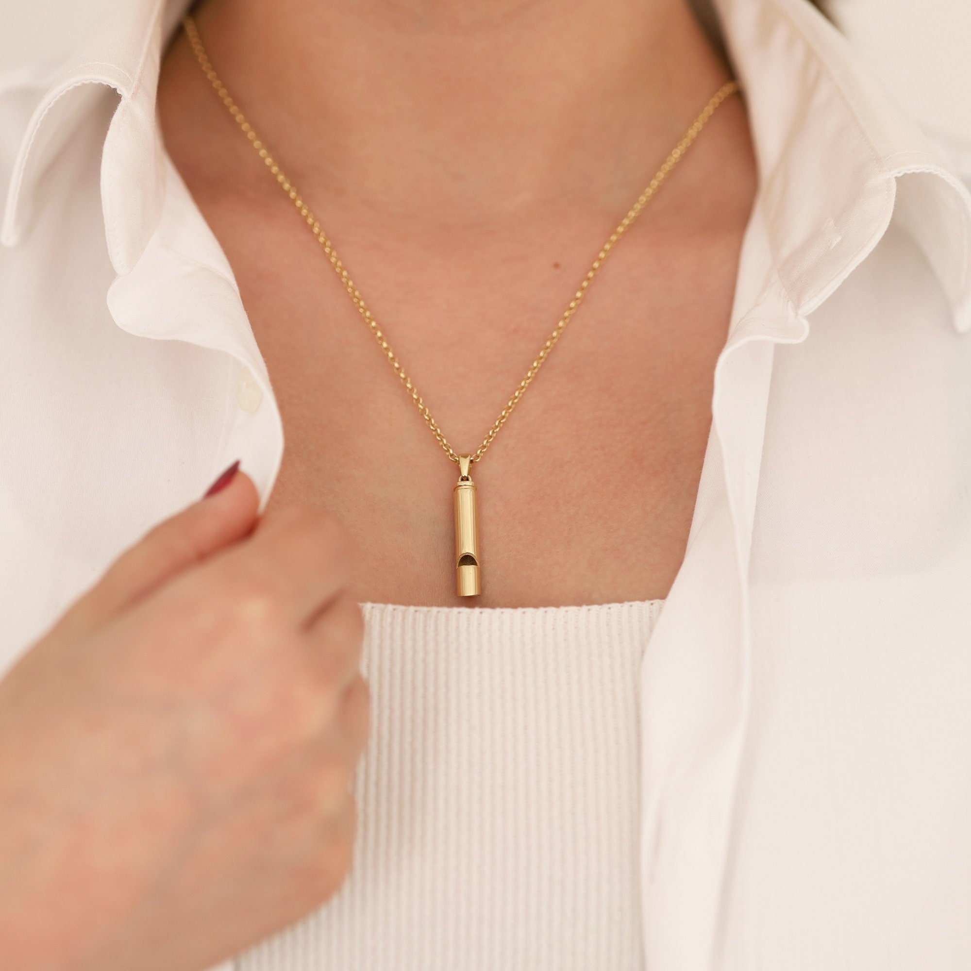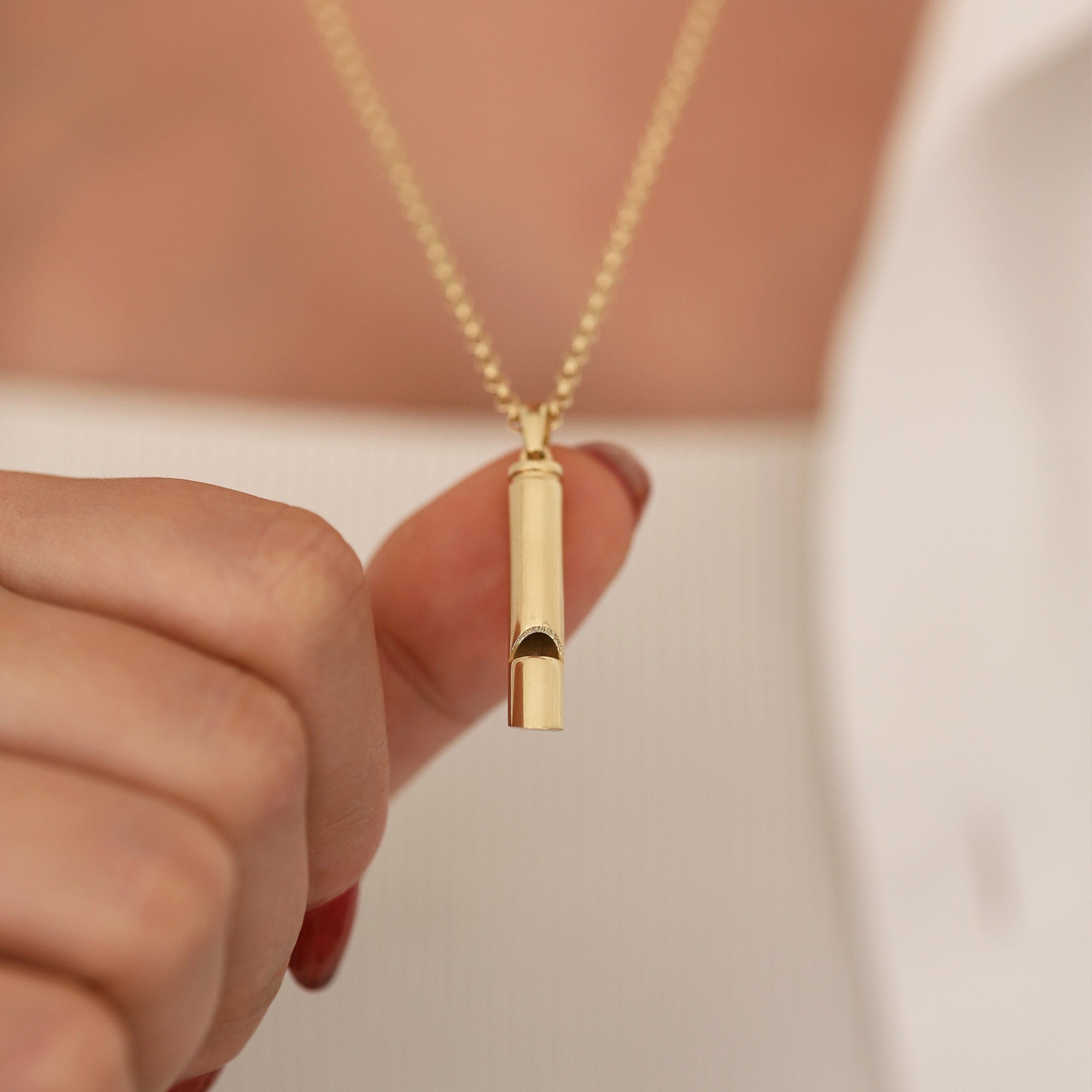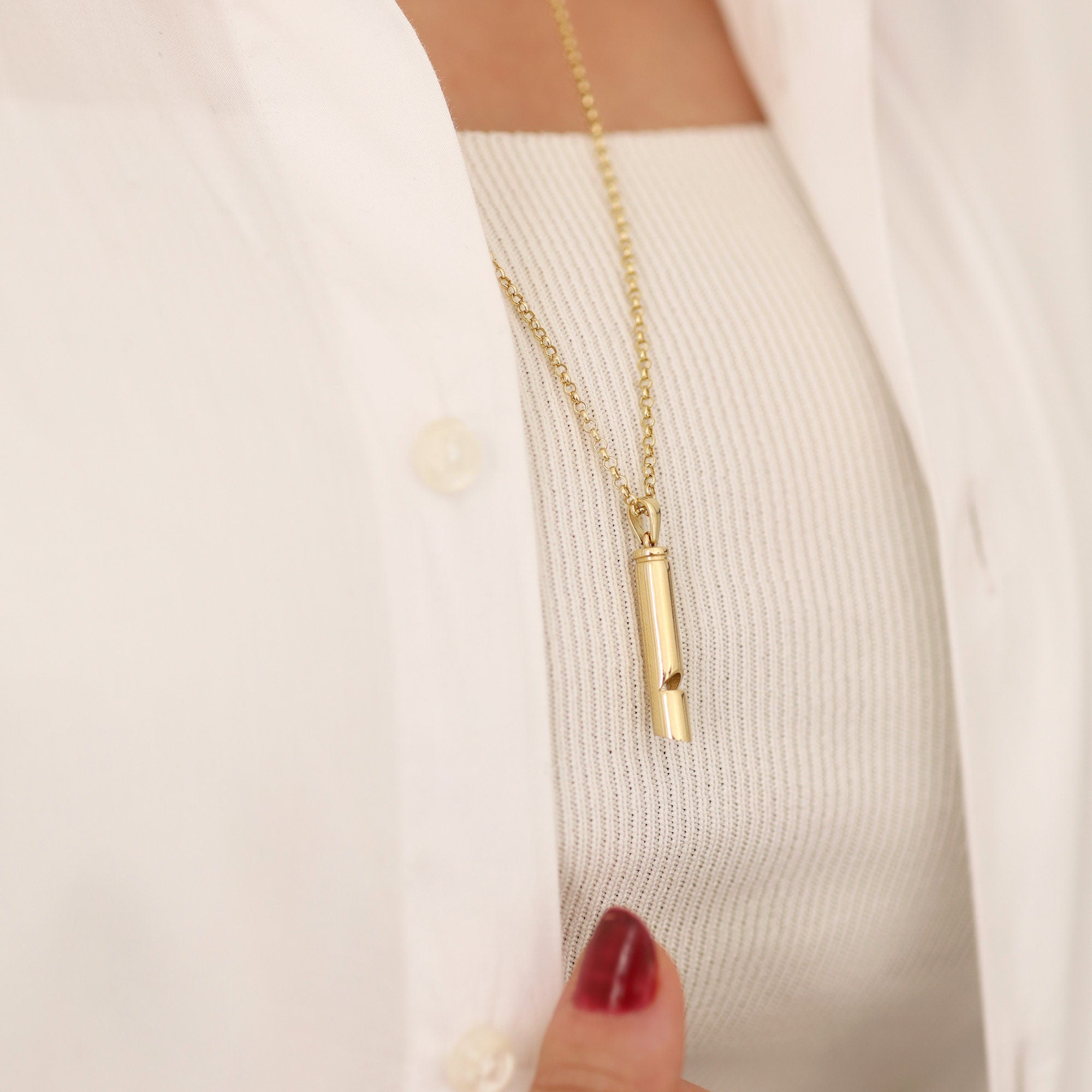 The 14k Gold Whistle Necklace blends style with practicality, featuring a fully functional whistle pendant. Ideal for emergencies or as a unique accessory, it’s suitable for all ages and occasions. This one-of-a-kind necklace combines elegance and utility, offering both beauty and security in a single piece.